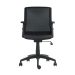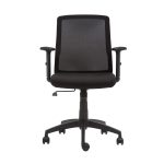 Silla Happy, Silla ejecutiva de respaldo en malla negra con apoyo lumbar fijo, asiento tapizado en tela negra, mecanismo reclinable con regulación de tensión del respaldo y regulación de altura, brazos fijos negros, base nylon negra.