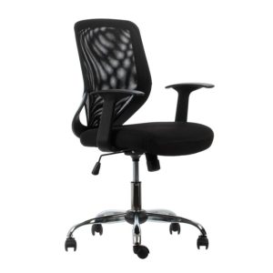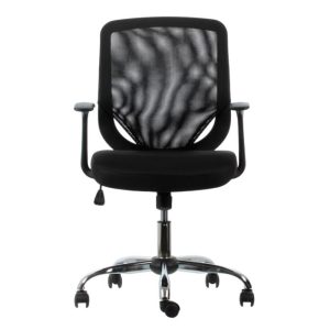 Silla de estructura cuatro patas de perfil redondo cromada. Respaldo en malla negra. Asiento tapizado en tela malla negra. Brazos fijos incorporados a su estructura.